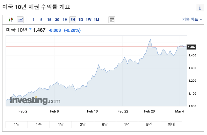 일반적으로 금리의 기준으로 보는 것을 미국의 10년물 채권 수익률 (금리)로 확인을 합니다. 최근 한달 간 미국 10년물 채권 금리를 보면 1.1 근방에서 1.6까지도 오른 상황을 볼 수 있습니다. 40~50%가 넘게 오른 금리때문에 주가가 떨어지고 있다는 것을 이제는 이해하실 수 있으실 거에요.