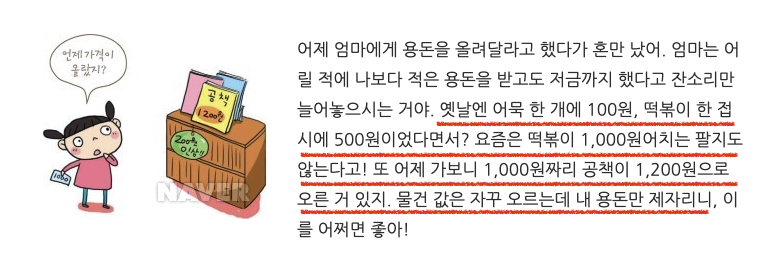 인플레이션을 잘 설명한 이미지를 가져와봤어요. 예전에는 정말로 떡볶이 한 접시를 먹기 위해서 500원만 있었으면 되었던거죠. 그런데 지금은 동일한 양의 떡볶이 한 접시를 먹기 위해서는 1000원이 필요하게 된 거에요. 그런데 내가 받는 용돈은 그대로라면, 내가 받는 용돈의 가치가 예전보다는 못하게 된거라고 할 수 있고 이게 바로 인플레이션을 의미해요.