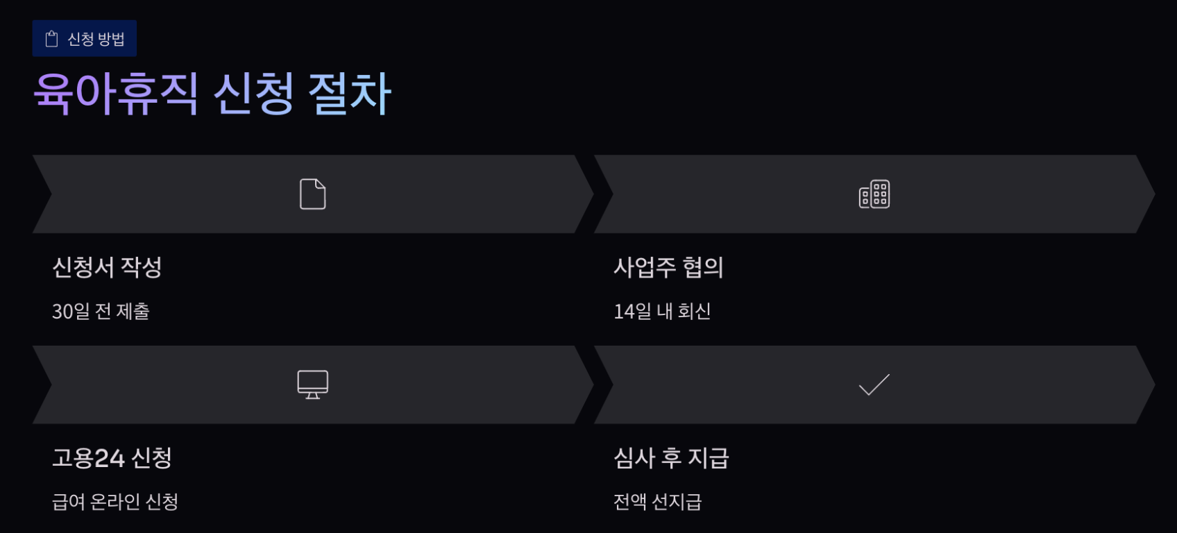 1. 고용24 접속 2. 육아휴직급여 신청 3. 서류 업로드 4. 심사 후 지급신청 기한