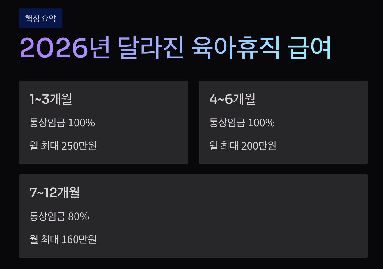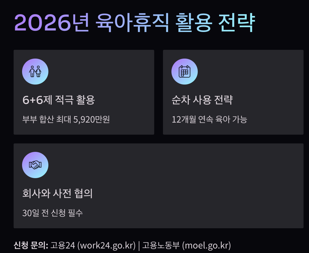 ⚠️ 면책사항 이 글은 2026년 1월 기준 고용보험법 시행령을 바탕으로 작성되었습니다. 실제 급여액은 개인의 통상임금, 육아휴직 기간, 6+6제 적용 여부에 따라 달라질 수 있으니, 정확한 계산은 고용24 또는 고용노동부와 상담하시기 바랍니다.