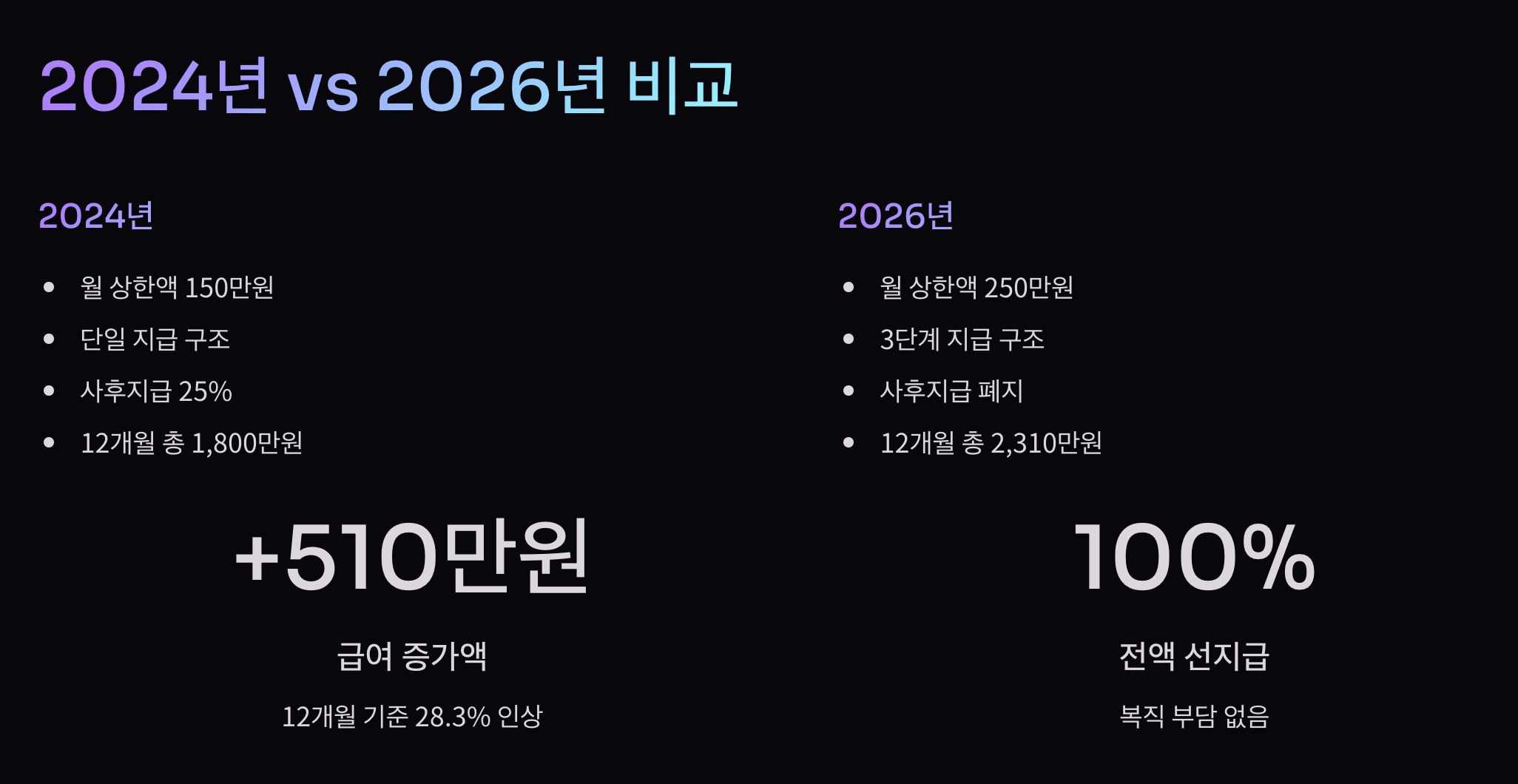 2024년: 1,800만원 2025~2026년: 2,310만원 ━━━━━━━━━━━━━━━━━━━━ 증가: +510만원 (+28.3%)6+6제 (부부 각 12개월)