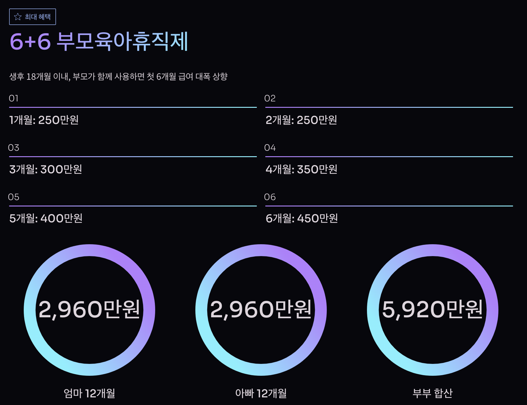 [1~6개월] 250만+250만+300만+350만+400만+450만 = 2,000만원 [7~12개월] 160만원 × 6 = 960만원 ━━━━━━━━━━━━━━━━━━━━ 총: 2,960만원아빠 급여 (6+6 적용)