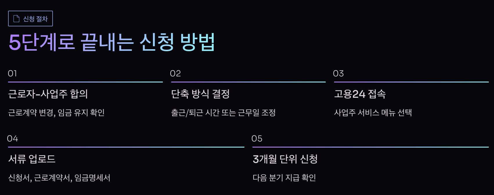 1. 근로자 신청 2. 사업주 동의 3. 근로계약 변경 4. 임금 유지 확인단축 방식 결정