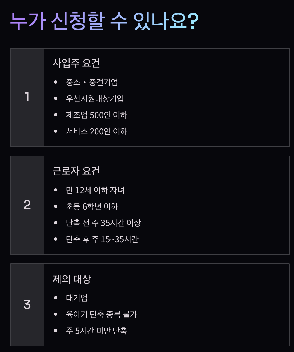 시행일 2026.1.1 대상 자녀 만 12세 또는 초등 6학년 이하 근로시간 주 15~35시간 임금 100% 유지 지원금 월 30만원 (사업주) 지원 기간 최대 12개월 💰 혜택 비교