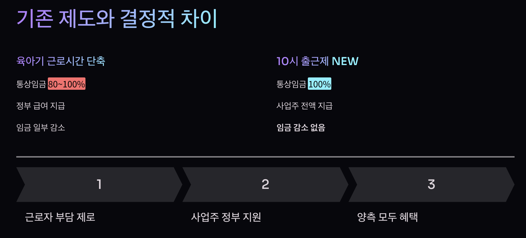 10시 출근제 vs 육아기 단축 ━━━━━━━━━━━━━━━━━━━━ 임금 100% 필요: 10시 출근제 더 긴 시간 단축: 육아기 단축 → 10시 출근제 우선 고려사업주