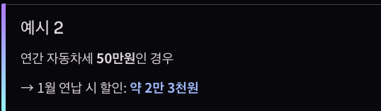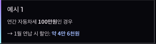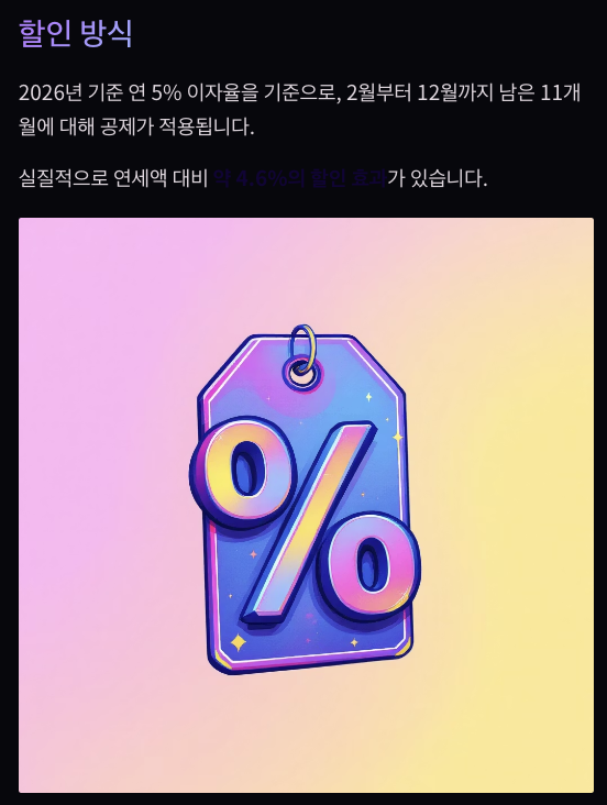 할인 방식 2026년 기준 연 5% 이자율을 기준으로, 2월부터 12월까지 남은 11개월에 대해 공제가 적용됩니다. 실질적으로 연세액 대비 약 4.6%의 할인 효과가 있습니다.