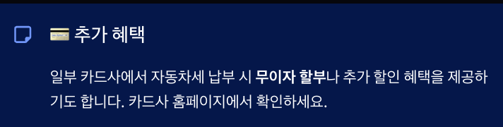 추가 혜택 일부 카드사에서 자동차세 납부 시 무이자 할부나 추가 할인 혜택을 제공하기도 합니다. 카드사 홈페이지에서 확인하세요.