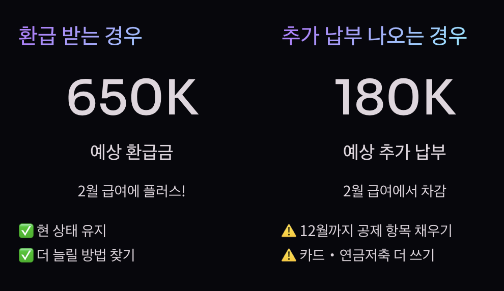 미리 확인하는 게 핵심 1월 되면 이미 늦어요. 미리 확인해서 전략 세워야 해요. 토해낼 것 같으면 지금 손 쓰고, 환급 받을 것 같으면 더 늘릴 방법 찾으면 돼요.