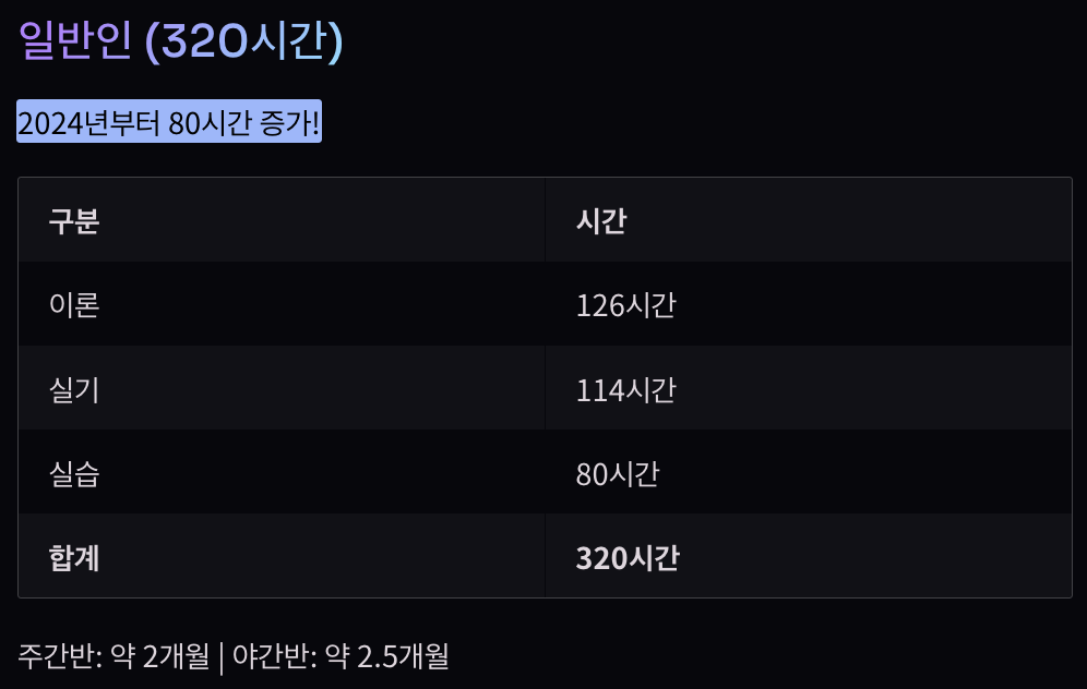 이론 126시간 실기 114시간 실습 80시간 합계 320시간 소요 기간