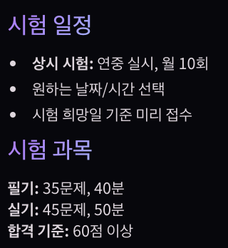교육 신청 (3일) ↓ 교육 이수 (2~2.5개월) ↓ 시험 접수 (1주일) ↓ 시험 응시 (1일) ↓ 합격 발표 (다음날) ↓ 자격증 발급 (1~2주) 총 약 2.5~3개월국가자격 소지자