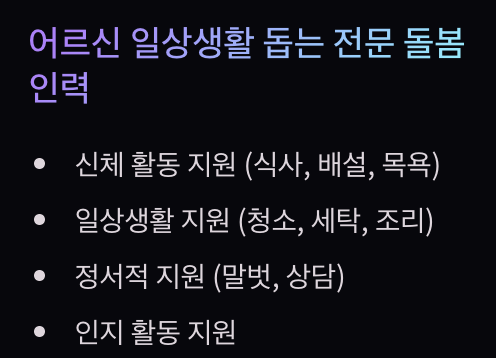 - 신체 활동 지원 (식사, 배설, 목욕)