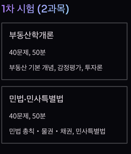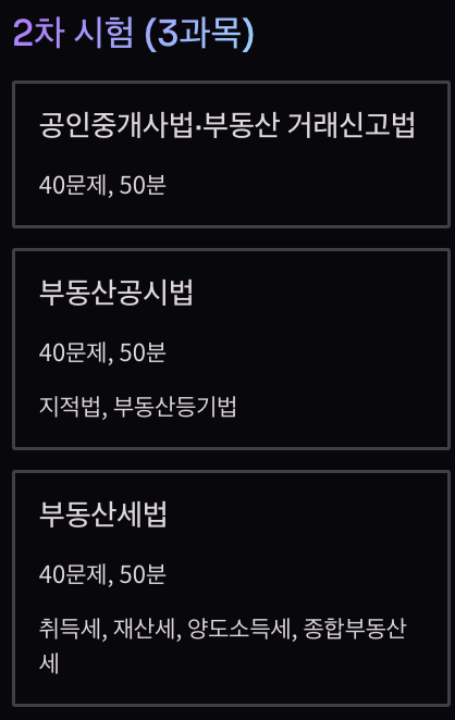 1교시 14:00~14:50 (50분) 공인중개사법·부동산 거래신고법 40문제 2교시 15:30~16:20 (50분) 부동산공시법 40문제 3교시 17:00~17:50 (50분) 부동산세법 40문제 주의!