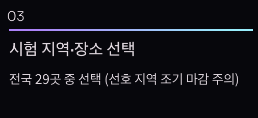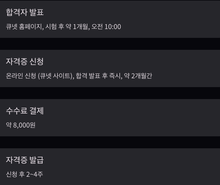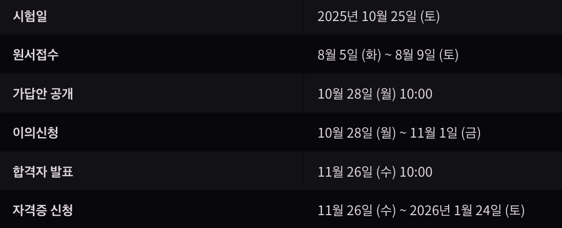 원서접수 8월 5일 (화) ~ 8월 9일 (토) 시험일 10월 25일 (토) 가답안 공개 10월 28일 (월) 10:00 이의신청 10월 28일 (월) ~ 11월 1일 (금) 합격자 발표 11월 26일 (수) 10:00 자격증 신청 11월 26일 (수) ~ 2026년 1월 24일 (토) 2026년도 이 패턴 그대로!