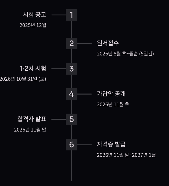 시험 공고 2025년 12월 원서접수 2026년 8월 초~중순 (5일간) 1·2차 시험 2026년 10월 31일 (토) 가답안 공개 2026년 11월 초 합격자 발표 2026년 11월 말 자격증 발급 2026년 11월 말~2027년 1월