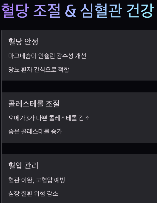 마그네슘이 혈관을 이완시켜 고혈압 예방에 도움을 줍니다. 심장 질환 위험을 줄이는 데 효과적입니다.