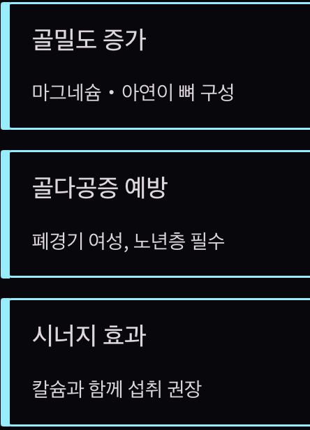 폐경기 여성이나 노년층이 꾸준히 먹으면 뼈 건강을 유지하는 데 도움이 됩니다. 칼슘과 함께 섭취하면 효과가 더 좋습니다.