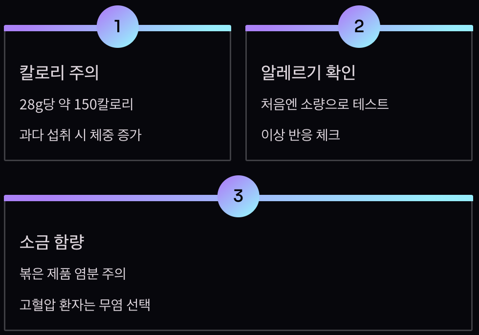 알레르기가 있는 분들은 처음에 소량만 먹어보고 이상이 없는지 확인하세요. 볶은 호박씨는 소금이 많이 들어갈 수 있으니 혈압이 높은 분들은 무염 제품을 선택하세요.