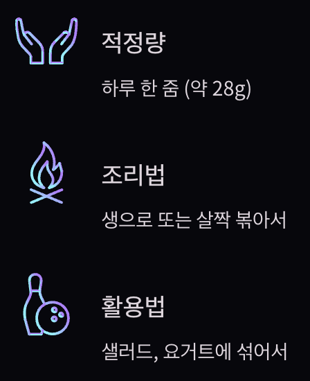 생으로 먹거나 살짝 볶아서 먹으면 됩니다. 샐러드에 뿌리거나 요거트에 섞어 먹어도 좋습니다. 껍질째 먹는 것이 영양소를 더 많이 섭취할 수 있습니다.