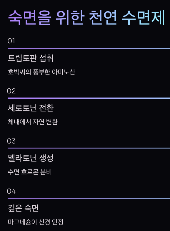 호박씨에는 트립토판이라는 아미노산이 풍부합니다. 트립토판은 체내에서 세로토닌과 멜라토닌으로 전환되어 숙면을 돕습니다.
