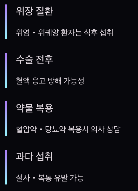 혈액 응고를 방해할 수 있어 수술 전후에는 섭취를 피해야 합니다. 혈압약이나 당뇨약을 복용 중이라면 의사와 상담 후 드세요. 과다 섭취 시 설사나 복통이 생길 수 있습니다.